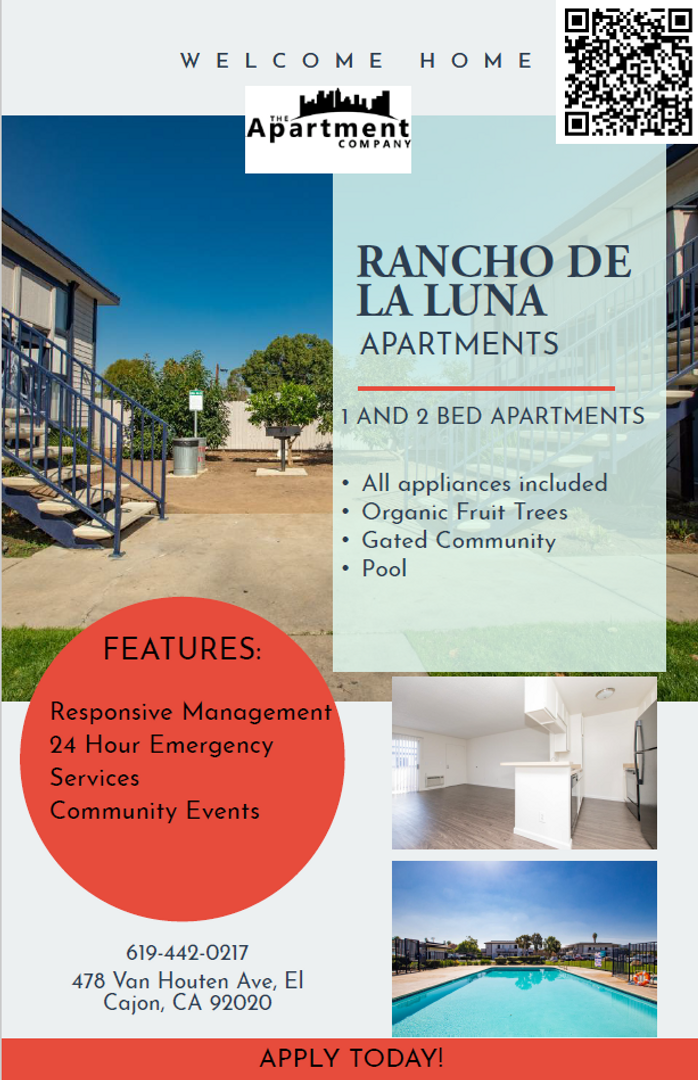 Looking for comfort, convenience, and a place you can truly call home? At Rancho De La Luna Apartment Homes, you’ll find just that — and more. Located in El Cajon, our community offers modern updates, efficient appliances, and thoughtful touches throughout all our 1, 2, and 3‑bedroom floorplans.